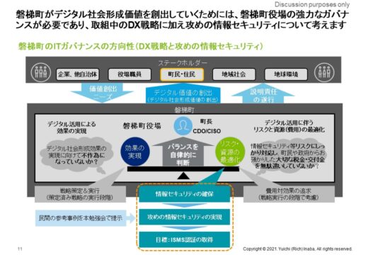 磐梯町のDX戦略を断行し住民の皆様や地域社会等にデジタル社会形成価値を創出するために、情報セキュリティ面にフォーカスして、重要情報をしっかり守るとともに、DX戦略を前に進めるためのアクセルとするような攻めの情報セキュリティについて、私の民間企業における実務事例を題材に有意義な議論ができたと思っております。